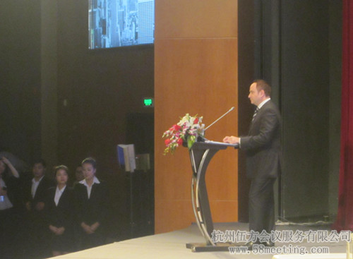 主持人上臺(tái)演講,幕布后面的同聲傳譯人員開始緊張的工作。浙江省人大副主任丁敏哲為本次大會(huì)致辭。