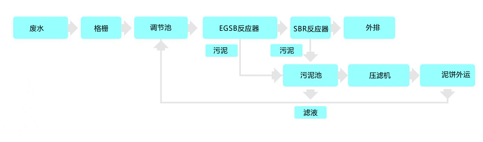 EGSB與SBR反應器所產生的污泥收集到污泥池,經過壓濾機處理成濾餅后外運,所產濾液回流至調節池。