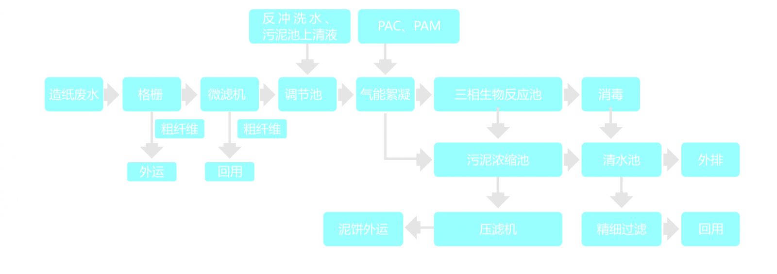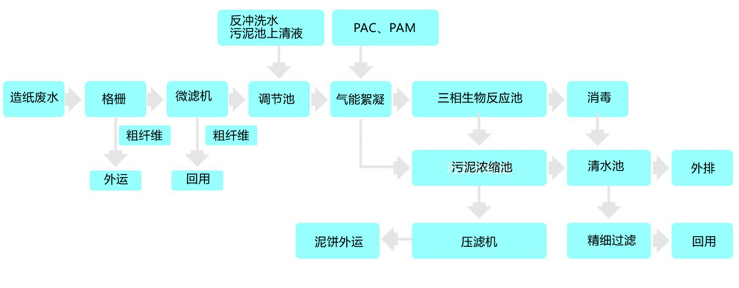 廢水通過格柵去除浮渣,經由微濾機回收紙漿后進入氣能絮凝系統,通過投加混凝劑,再經其凝聚、氣浮、撇渣、沉淀、刮泥處理后可去除污水中85% 以上的SS, 50%以上的非溶解性COD及部分溶解性COD和BOD。其出水進入完全混合式曝氣池,通過向池內補充投加N、P等營養物質,并利用吸附再生池增強回流污泥的微生物活性等方式高效降解污水中的有機物質。出水經由二沉池進行固液分離,上清液消毒達標后外排或精細過濾后回用。
