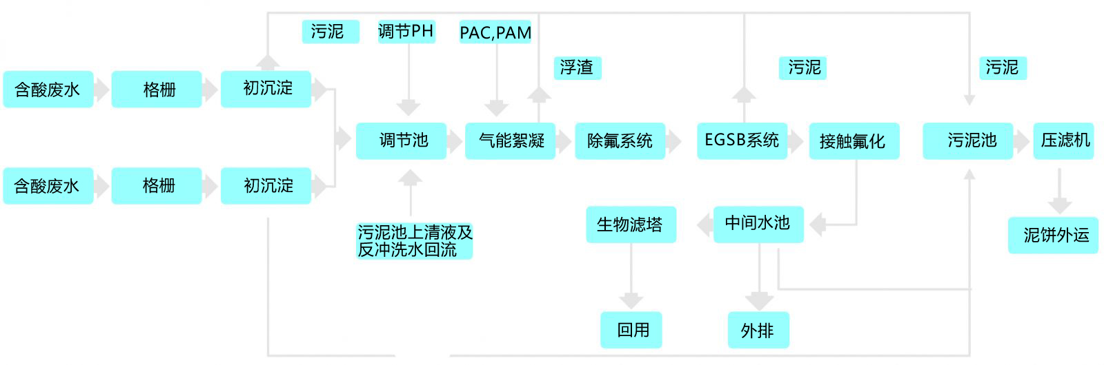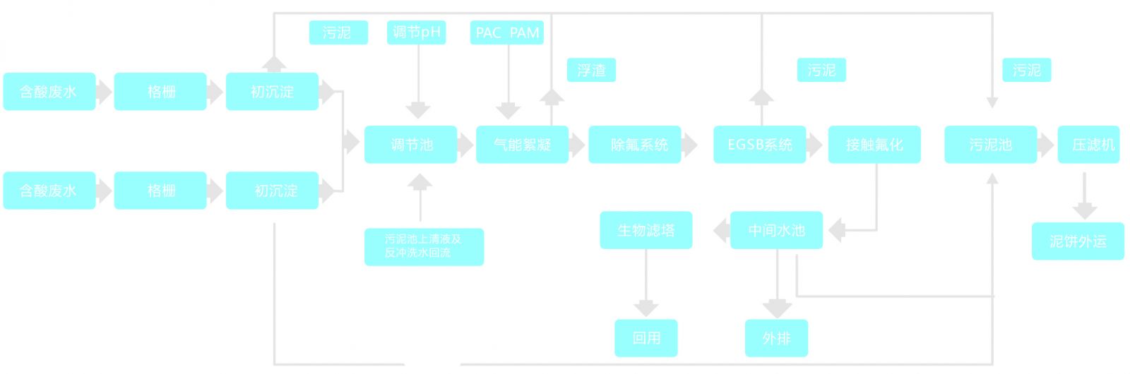 各生產(chǎn)車(chē)間外排廢水(酸水和堿水分流)由管網(wǎng)經(jīng)格柵排渣后進(jìn)入初沉池,靜沉去除大部分浮渣與大顆粒污染物后進(jìn)入調(diào)節(jié)池,調(diào)節(jié)pH后提升至氣能絮凝池,投加絮凝劑進(jìn)一步去除水中懸浮物,出水進(jìn)入除氟裝置,通過(guò)投加專用活性吸附劑去除水中高濃度的氟化物。接著進(jìn)入EGSB反應(yīng)器進(jìn)行生化處理,利用兼性及專性厭氧菌降解污水中COD,并將大分子有機(jī)物分解為小分子化合物以改善其可生化性,出水進(jìn)入接觸氧化池,通過(guò)負(fù)載于填料上生物膜的作用,進(jìn)一步去除水中COD等有機(jī)污染物,經(jīng)由中間水池進(jìn)行固液分離后上清液水質(zhì)達(dá)標(biāo)外排,或進(jìn)入生物濾塔深度處理后回用。