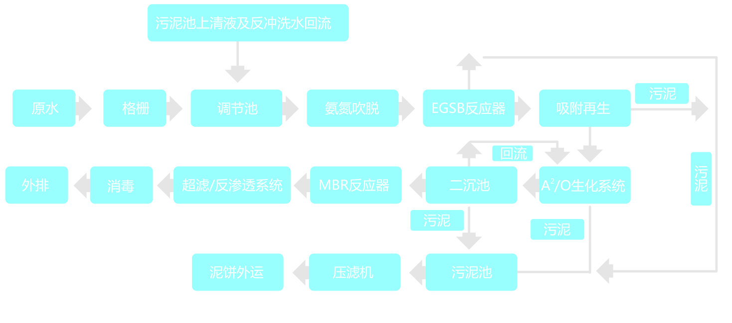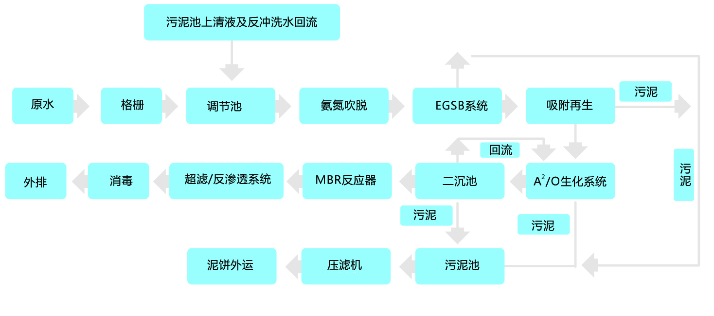 EGSB反應(yīng)器、吸附再生池及二沉池產(chǎn)生的剩余污泥收集于污泥池,濃縮并經(jīng)壓濾機(jī)脫水后外運。