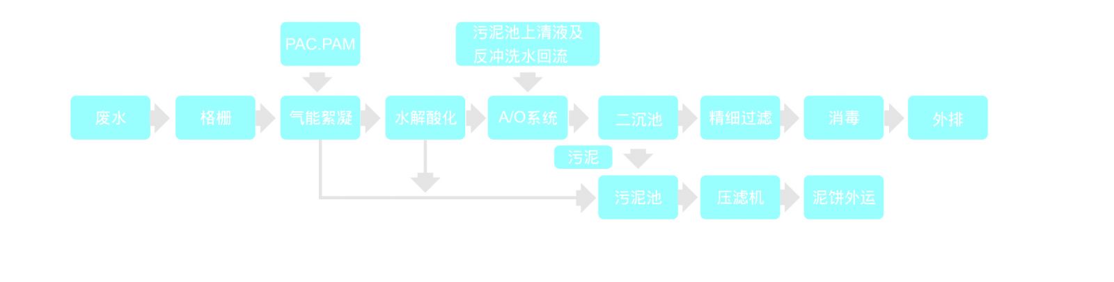 生產廢水經過格柵排至氣能絮凝系統,加入混凝藥劑,去除廢水中的色度和懸浮物后進入水解酸化池,將廢水中溶解性大分子有機物轉化為結構簡單的小分子物質,提高廢水可生化性,出水接著進入A/O系統,通過缺氧/好氧工段高效去除COD并實現脫硝,經二沉池進行固液分離,上清液經精細過濾、消毒后達標外排。