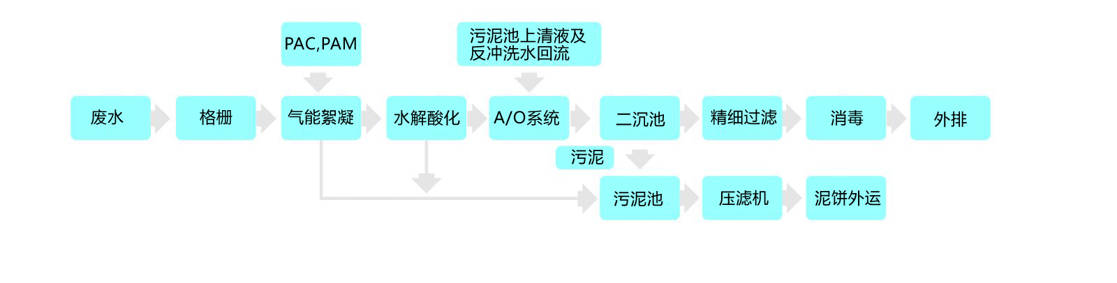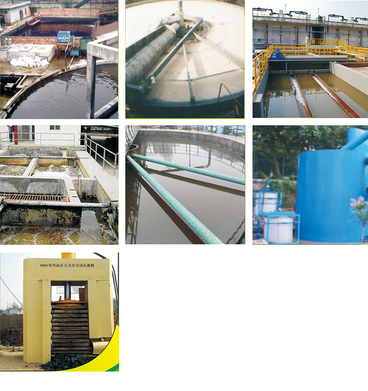 氣能絮凝系統的浮渣、水解酸化池的污泥和二沉池剩余污泥收集于污泥濃縮池,經壓濾機脫水后外運。