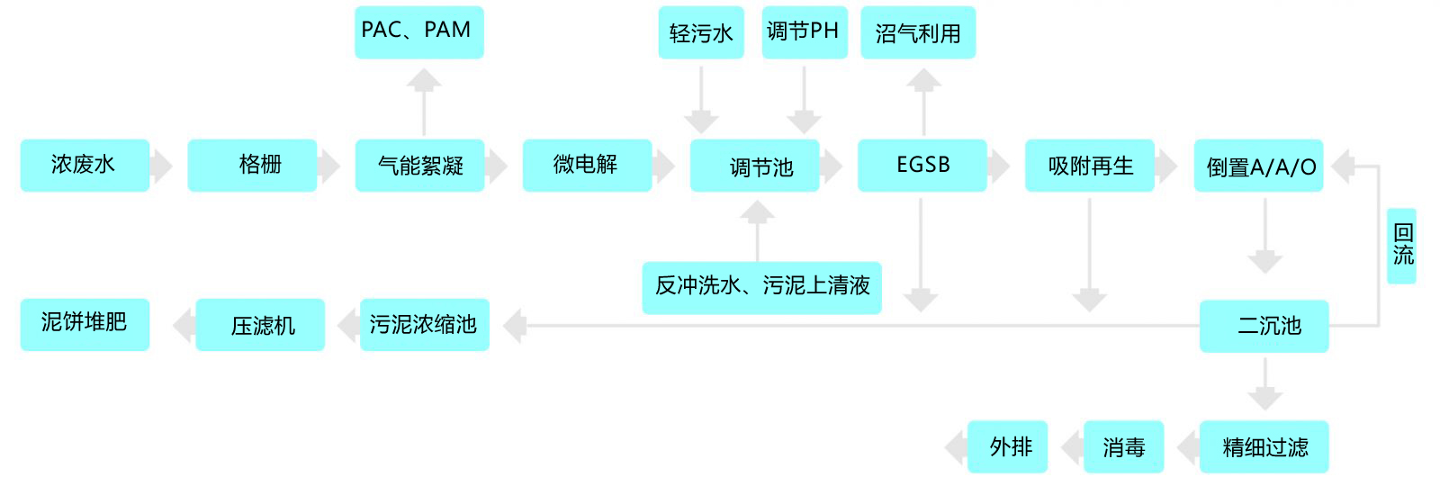 首先對濃污進行預處理,原水進入氣能絮凝系統去除懸浮物,進入鐵碳微電解系統,通過電絮凝原理去除部分磷及COD,處理后的出水和輕污在綜合調節池內調勻后進入EGSB反應器進行厭氧處理,在高效降解COD的同時利用原水中豐富的有機質產生沼氣,用于廠區內的鍋爐發熱,實現循環利用。