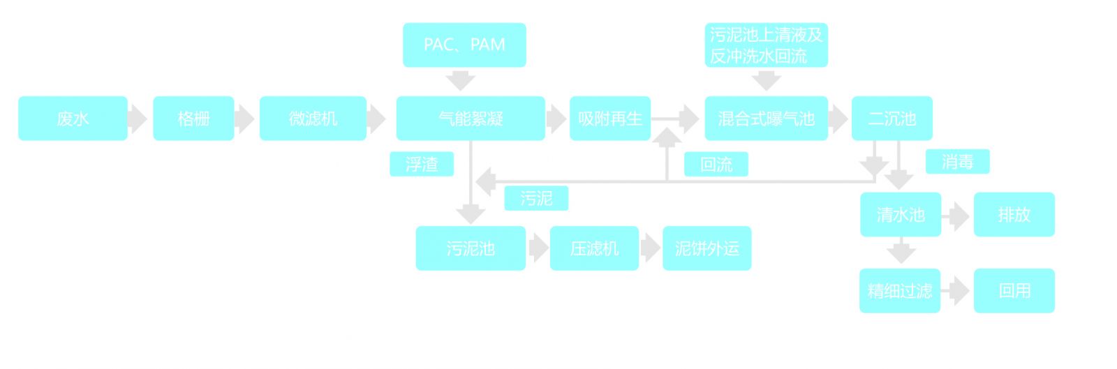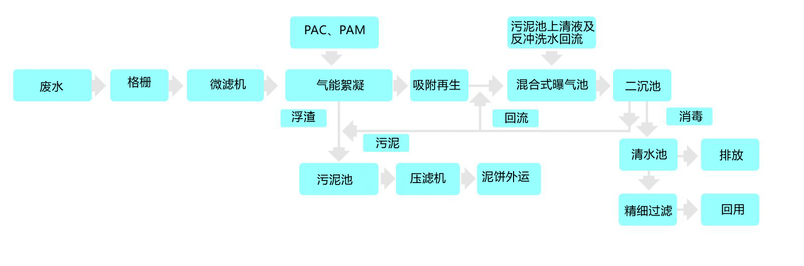 廢水通過格柵去除浮渣,經(jīng)由微濾機回收紙漿后進入氣能絮凝系統(tǒng),通過投加混凝劑,再經(jīng)其凝聚、氣浮、撇渣、沉淀、刮泥處理后可去除污水中85% 以上的SS, 50%以上的非溶解性COD及部分溶解性COD和BOD。其出水進入完全混合式曝氣池,通過向池內(nèi)補充投加N、P等營養(yǎng)物質(zhì),并利用吸附再生池增強回流污泥的微生物活性等方式高效降解污水中的有機物質(zhì)。出水經(jīng)由二沉池進行固液分離,上清液消毒達標后外排或精細過濾后回用。