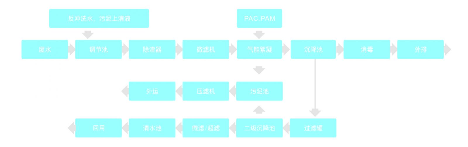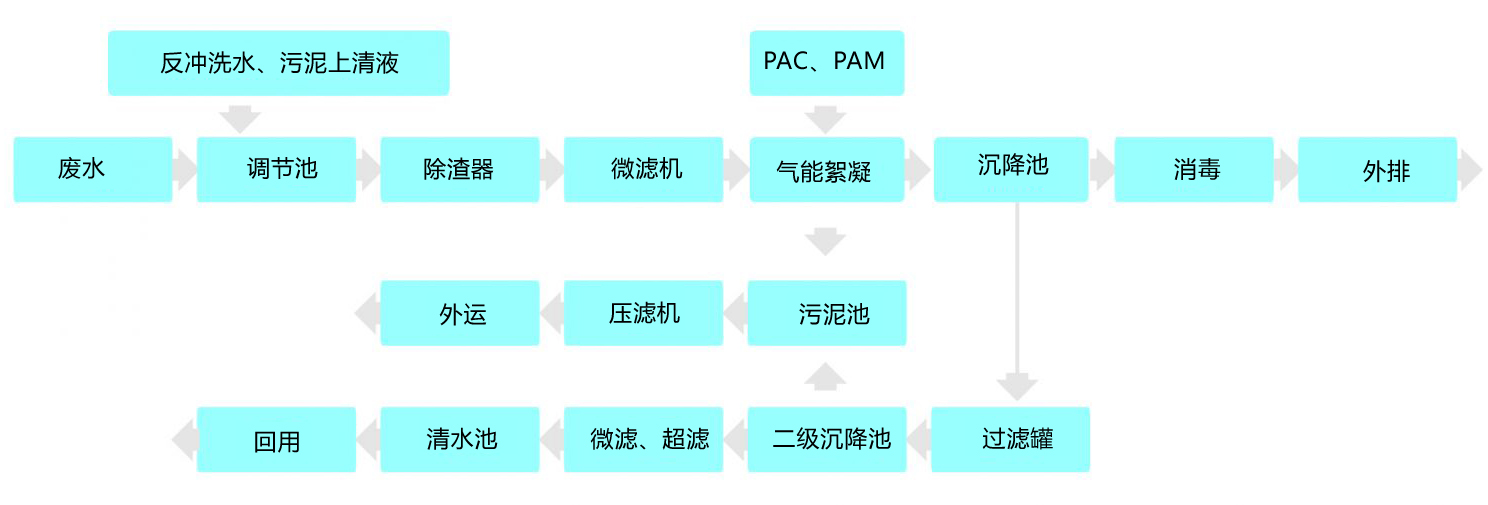廢水首先進(jìn)入調(diào)節(jié)池進(jìn)行水質(zhì)、水量調(diào)節(jié),提升后進(jìn)入兩級(jí)高濃除渣器去除廢水中的顆粒雜質(zhì),然后經(jīng)微濾機(jī)收集廢水中相對(duì)細(xì)小的棉渣回用,為后續(xù)處理工藝減輕負(fù)荷。出水經(jīng)泵提升至氣能絮凝系統(tǒng)加藥(PAM與PAC)混合后去除原水中所含的大量膠質(zhì),出水到沉降池,上清液經(jīng)消毒后可達(dá)標(biāo)外排。如中水回用,則提升至多級(jí)精細(xì)過濾系統(tǒng)過濾后進(jìn)入中間水池,經(jīng)超濾系統(tǒng)處理后回用。