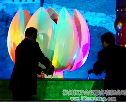 各相關領導上臺,共同端起酒杯(或酒瓶),往發光水晶體里緩緩注入酒,注滿后則慢慢顯示出公司的LOGO將氣氛渲染出來。(酒也可以換成其它溶液,用一些化學劑顯示出不同需求的液體顏色。) 伍方會議服務一般會在透明冰雕內雕刻出LOG0,數字,字母,漢字等,由主嘉賓們一起往冰雕內注入紅酒,所刻之物將在冰雕里緩緩呈現。寓指合作成功,意為祝酒。