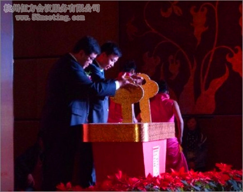 舞臺前制作一個主辦方LOGO模型,模型后設置一個鑰匙孔,將啟動道具設置為鑰匙形狀,啟動儀式開始時各領導將鑰匙插入鑰匙孔,并順時針扭動,打開之后則呈現出相關的產品或者模型。